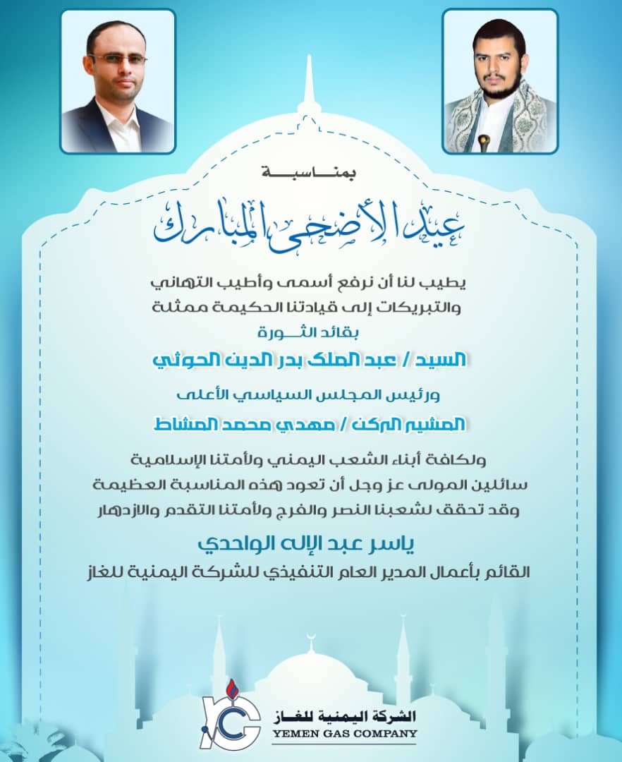 رفع القائم بأعمال المدير التنفيذي للشركة اليمنية للغاز ياسر الواحدي، برقية تهنئة إلى قائد الثورة السيد عبد الملك بدر الدين الحوثي، ورئيس المجلس السياسي الأعلى المشير الركن مهدي المشاط وأعضاء المجلس بعيد الأضحى.