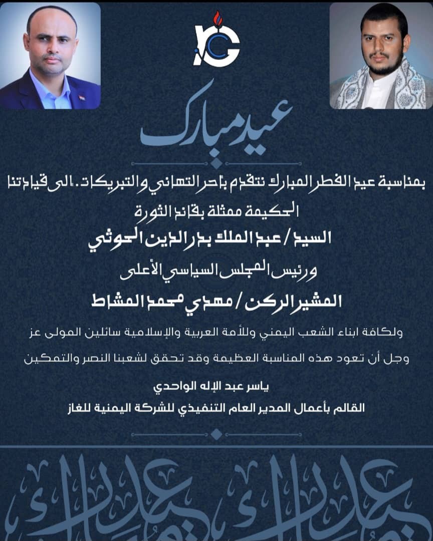 المدير العام التنفيذي للشركة اليمنيه للغاز الاستاذ/ياسر عبدالإله الواحدي يهنئ قائد الثورة السيد/عبدالملك بدرالدين الحوثي ورئيس المجلس السياسي الأعلى المشير الركن/ مهدي محمد المشاط والشعب اليمني و الأمة العربية والإسلامية بمناسبة حلول عيد الفطر المبارك