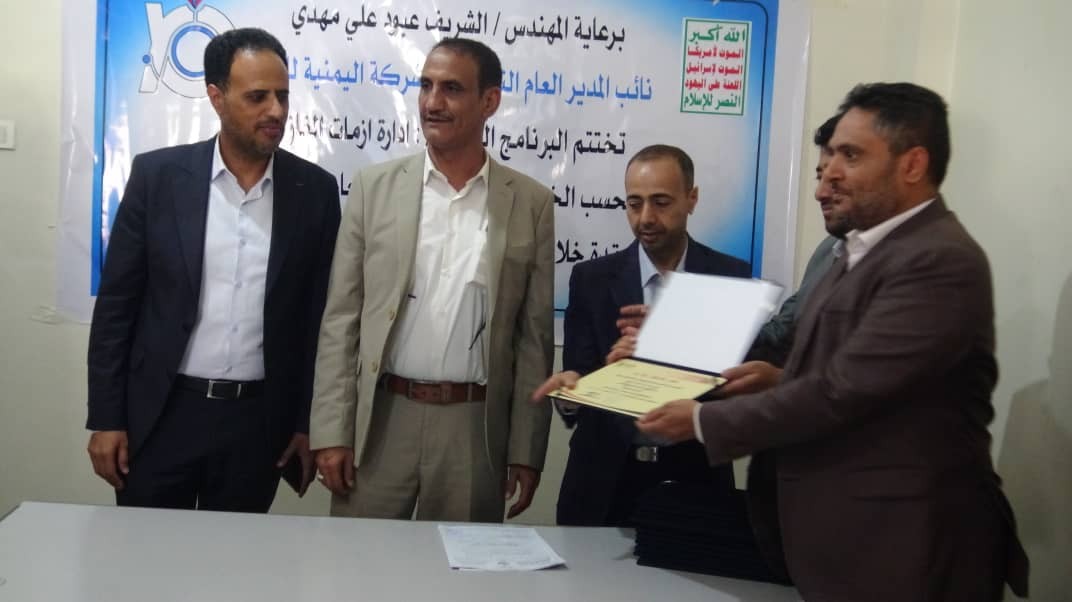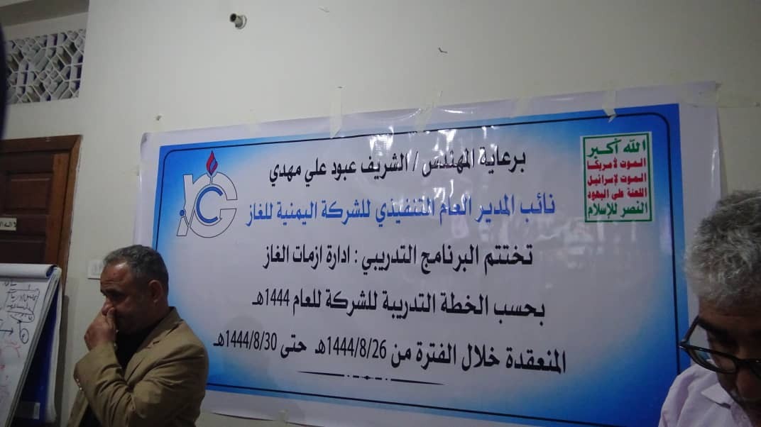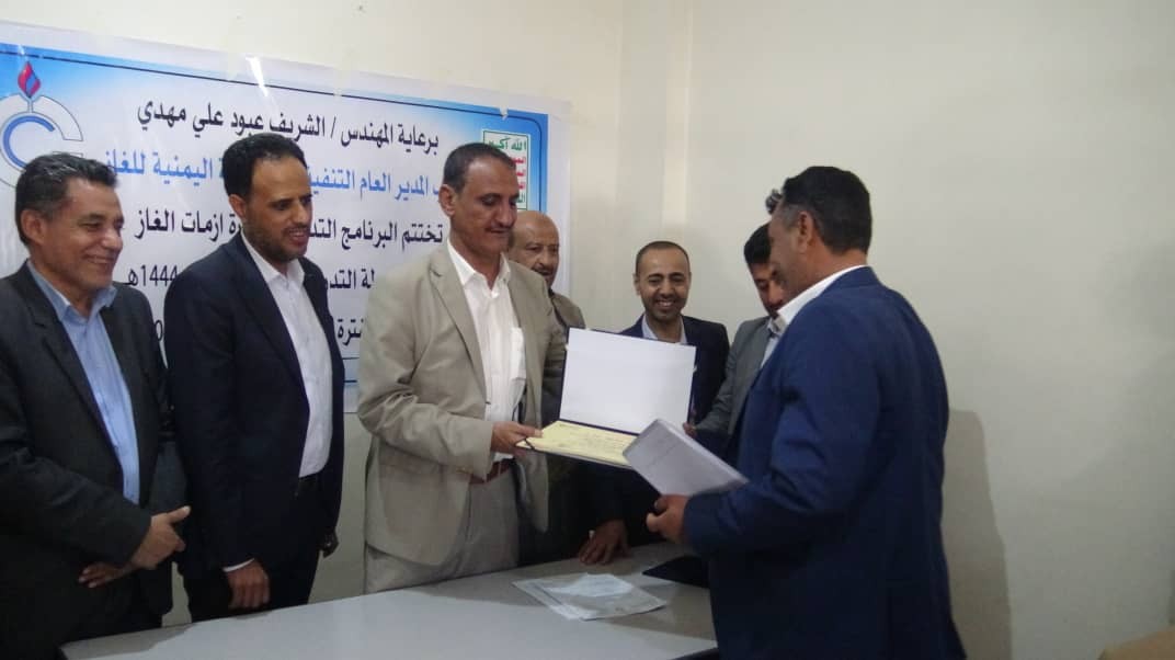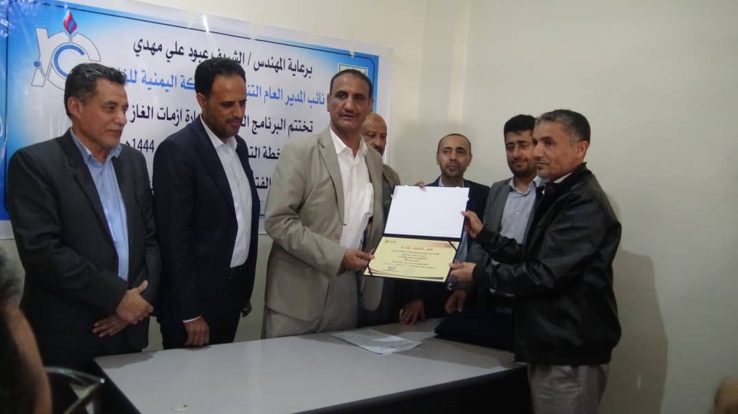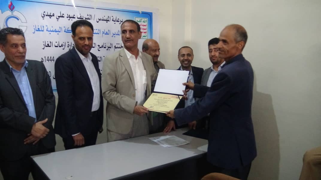 اختتمت الاربعاء الموافق 30/8/144هـ بالشركة اليمنية للغاز دورة تدريبية في مجال إدارة أزمات الغاز لـ 12 متدرباً من كوادر الشركة في أمانة العاصمة ومحافظة عمران.