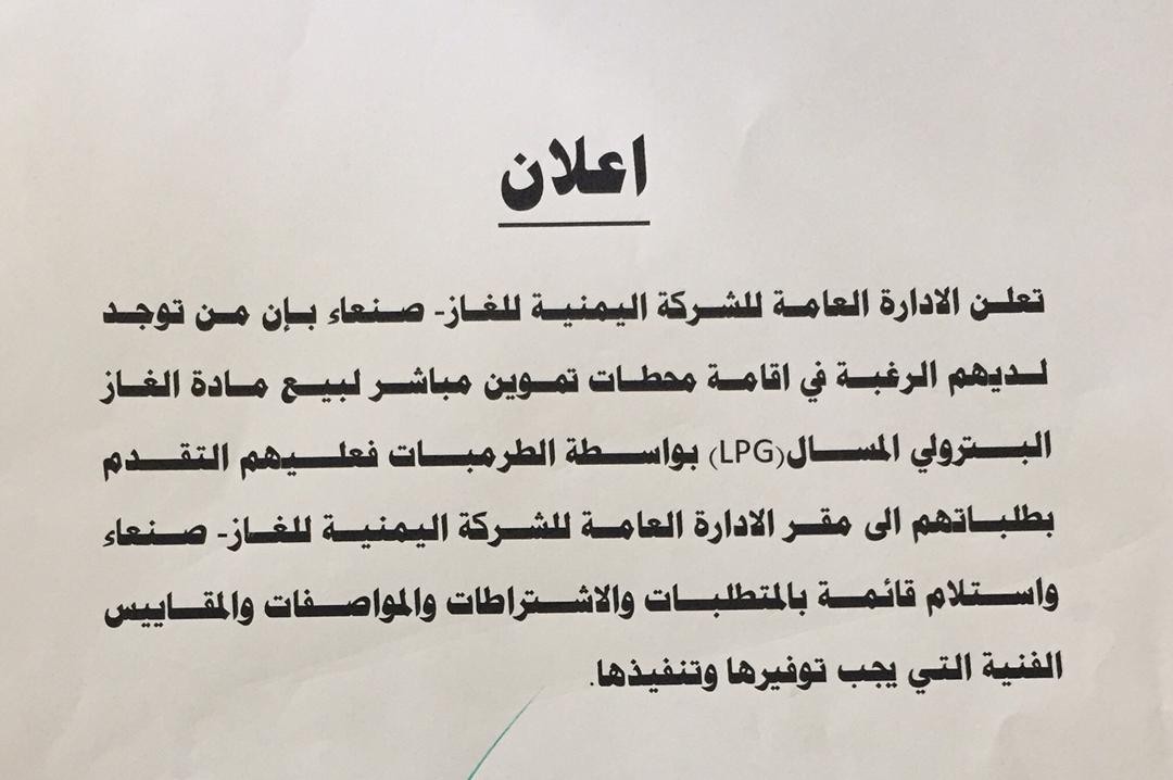 تعلن الادارة العامة للشركة اليمنية للغاز- صنعاء بإن من توجد لديهم الرغبة في اقامة محطات تموين مباشر لبيع مادة الغاز البترولي المسال(LPG) بواسطة الطرمبات فعليهم التقدم بطلباتهم الى مقر الادارة العامة للشركة اليمنية للغاز- صنعاء واستلام قائمة بالمتطلبات والاشتراطات والمواصفات والمقاييس الفنية التي يجب توفيرها وتنفيذها.