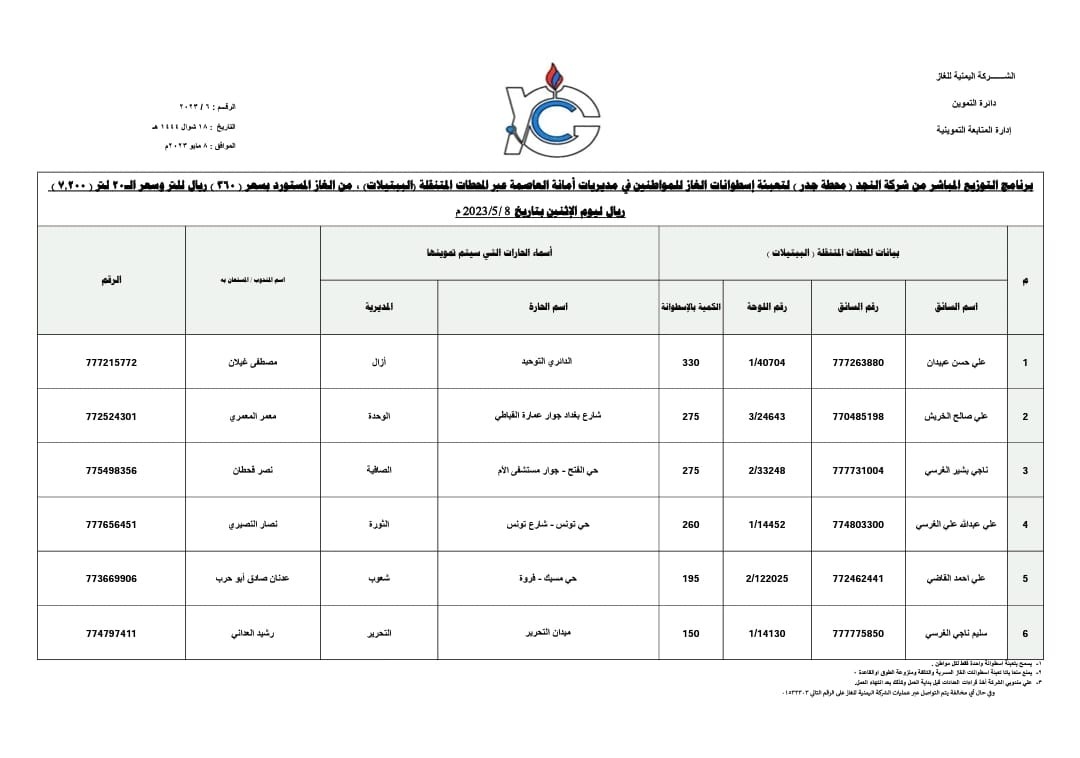 وتنوه الشركه اليمنيه للغاز للاخوه المواطنين انه سيتم تنفيذ برنامج البيع المباشر من الغاز المستورد للمواطنين عبر المحطات المتنقله في مديريات امانة العاصمه وتدعوهم إلى الالتزام بشروط الأمن والسلامة عند اقتناء حاجتهم من الغاز حرصا على سلامتهم.