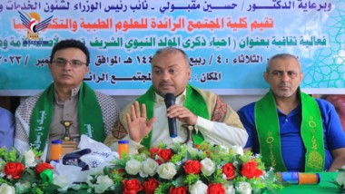 وفي الفعالية، أستعرض نائب رئيس الوزراء لشؤون الخدمات والتنمية الدكتور حسين مقبولي الأهداف السامية والدلالات العظيمة للاحتفاء بذكرى مولد النبي والدروس والعظات من سيرته للتصدي للمشاريع التي تسعى لتجريد الأمة عن قيمها ومبادئها.