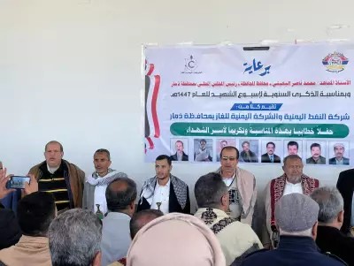 نظّم فرعا شركتي النفط والغاز بمحافظة ذمار، اليوم، فعاليةً ثقافية وتكريمًا لأسر الشهداء من منتسبي النفط والغاز بالمحافظة، بمناسبة الذكرى السنوية للشهيد 1447هـ.